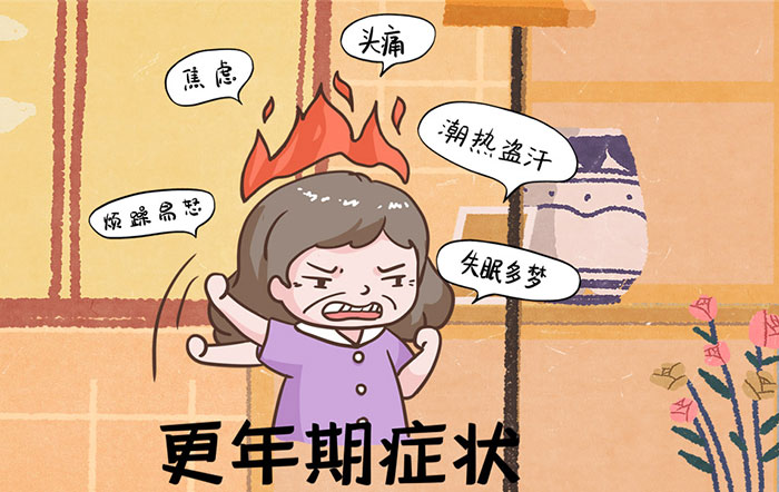 女性更年期多發(fā)生于42~52歲,這一時(shí)期由于卵巢功能減退,對(duì)下丘腦和垂體的抵制減弱,垂體功能一時(shí)性亢進(jìn),引起一系列以植物神經(jīng)功能失調(diào)為主的癥候群,比如月經(jīng)不調(diào)、陣發(fā)性潮熱、煩躁易怒、焦慮、失眠多夢(mèng)、頭昏目眩、記憶力減退、腰酸背痛等。