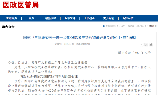 為進(jìn)一步加強(qiáng)抗微生物藥物管理,積極應(yīng)對(duì)微生物耐藥,持續(xù)提高臨床合理用藥水平,2021年4月7日國家衛(wèi)生健康委印發(fā)了《關(guān)于進(jìn)一步加強(qiáng)抗微生物藥物管理遏制耐藥工作的通知》(以下簡(jiǎn)稱通知)。