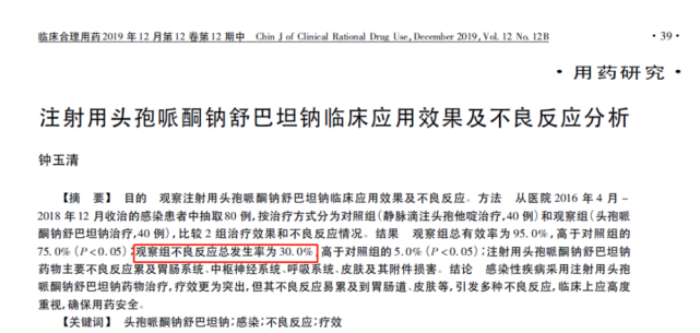 有文獻(xiàn)報(bào)道頭孢哌酮舒巴坦的不良反應(yīng)發(fā)生率高達(dá)30%。另外,還有頭孢哌酮舒巴坦引起嚴(yán)重的凝血功能異常致出血死亡的臨床報(bào)道。