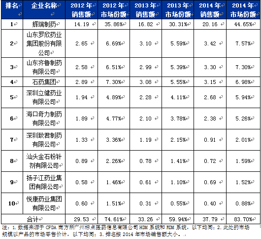 2014年輝瑞制藥"頭孢哌酮舒巴坦1:1"(商品名:舒普深)的市場(chǎng)規(guī)模位居頭孢類抗生素市場(chǎng)的第三位,頭孢類復(fù)方制劑市場(chǎng)的首位,市場(chǎng)規(guī)模為45.15億元。