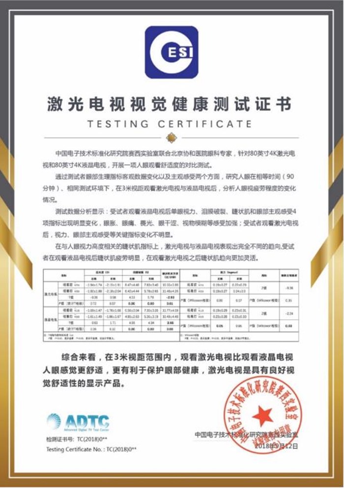 目前我國近視患者接近7億,青少年近視率高居全世界第一,近視已經(jīng)成為全社會關注的問題。手機、電腦、電視等電子產(chǎn)品的使用,成為防控近視的著力點。在這樣的背景下,2019年,中國電子技術標準化研究院賽西實驗室和北京協(xié)和醫(yī)院眼科專家團隊,進行了一次電子產(chǎn)品視覺健康測試的課題研究。專家進行144組測試數(shù)據(jù)嚴格對比后證實:長時間觀看液晶電視眼睛會產(chǎn)生一定的眼脹、眼痛、畏光、眼干澀、視物模糊等癥狀;而觀看激光電視沒有明顯的視力變化和眼部不適感受,視覺舒適度好,更有利于保護眼部的健康。