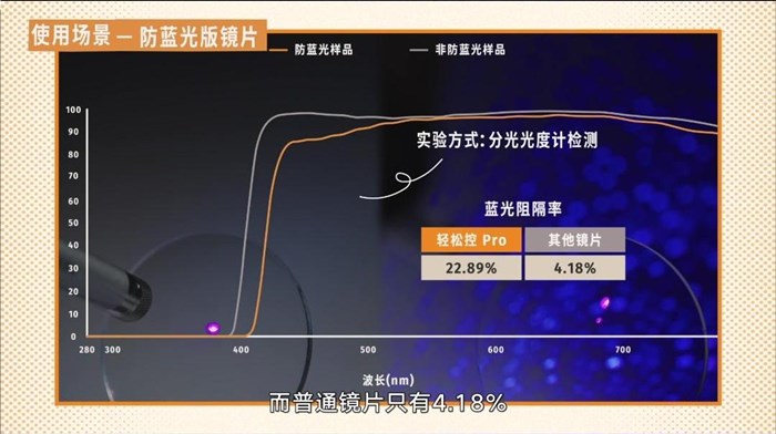經(jīng)測定,輕松控Pro的藍(lán)光阻隔率為22.89%,而普通鏡片只有4.18%。輕松控Pro防藍(lán)光版,更適合經(jīng)常上網(wǎng)課的小朋友。