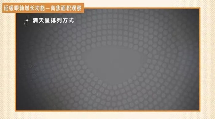 離焦鏡片上的微透鏡,就是能實(shí)現(xiàn)膜前離焦效果的關(guān)鍵。我們用投影的方式可以看到,輕松控Pro的鏡片上設(shè)計(jì)了大量微透鏡,并且它們以滿天星的排列方式,增加離焦面積。很多論文都表明,增加離焦面積可以強(qiáng)化控制眼軸增長的效果。