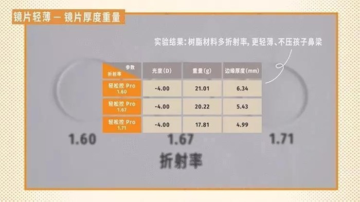 而且,只有樹脂材料可以做不同折射率鏡片。輕松控Pro就有多款折射率鏡片可選,能更好呵護(hù)孩子本就脆弱的鼻梁,減輕鼻梁壓力。