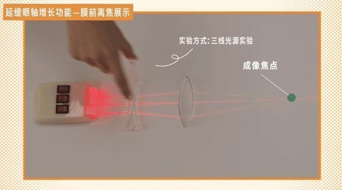 當(dāng)我們模擬離焦鏡片的成像原理時(shí),發(fā)現(xiàn)若光線只通過單光鏡片時(shí),此時(shí)周邊區(qū)域成像離視網(wǎng)膜較遠(yuǎn),但加入凸透鏡后,成像往前移,就可以把周邊區(qū)域膜后離焦變成膜前離焦,進(jìn)而延緩眼軸增長。