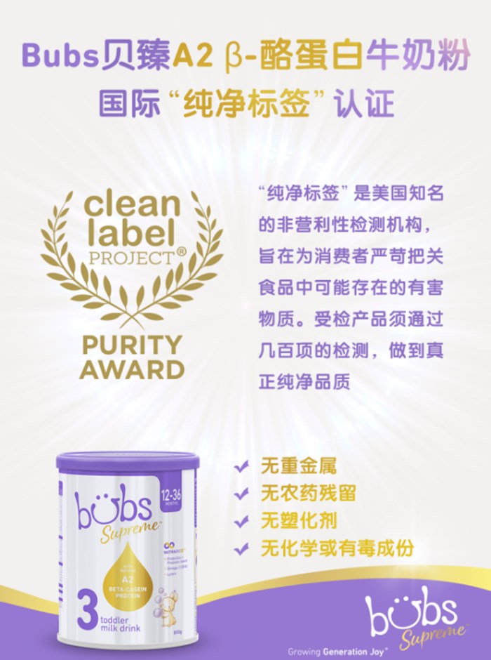 值得一提的是,Bubs貝臻 A2 β-酪蛋白牛奶粉還通過了由ISO認(rèn)證的第三方實(shí)驗(yàn)室檢測(cè),從高達(dá)400項(xiàng)的檢測(cè)項(xiàng)目中脫穎而出,獲得了國(guó)際“純凈標(biāo)簽”認(rèn)證,確定不含對(duì)寶寶成長(zhǎng)不利的有害添加物,家長(zhǎng)們可以放心給孩子喝。