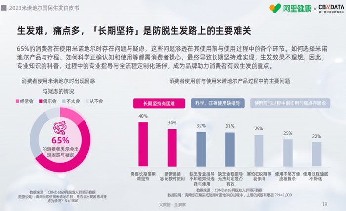 根據(jù)調(diào)研數(shù)據(jù),僅37%的消費(fèi)者能夠按專業(yè)建議每日2次使用米諾地爾產(chǎn)品,同時(shí),有65%以上的消費(fèi)者對米諾地爾使用存在疑惑和困擾,對及時(shí)的用藥提醒與日常科普專業(yè)知識存需求?;诖?,防脫生發(fā)頭部品牌如達(dá)霏欣,針對這一痛點(diǎn),全新升級「喚發(fā)服務(wù)」,致力于為消費(fèi)者提供全周期的科學(xué)用藥指導(dǎo)及陪伴,真正解決生發(fā)難題。