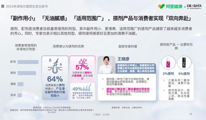 白皮書中顯示:搽劑因因其副作用小、更清爽、適用范圍廣等特點(diǎn),廣受消費(fèi)者歡迎。同時(shí),專家也表示:搽劑吸收更好,因乙醇及丙二醇濃度,膚感更加清爽不油膩。同時(shí),劑型設(shè)計(jì)使用方便,可以滿足針對性上藥需求,保證劑量準(zhǔn)確。搽劑產(chǎn)品實(shí)現(xiàn)防脫、生發(fā)的雙向奔赴。