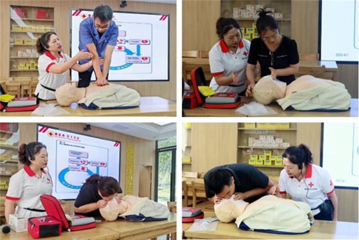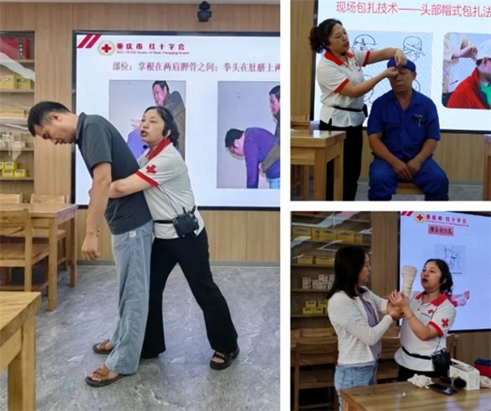 本次培訓主要以知識講解、現(xiàn)場示范和實踐操作相結合的形式,培訓老師讓太極桐君閣藥廠的員工在掌握知識的同時親自去體驗參與。培訓課上,講師用專業(yè)的理論知識和典型的實際案例,重點對心臟驟停、氣道異物梗阻、創(chuàng)傷止血包扎等常規(guī)應急救護項目展開講解,并現(xiàn)場用人體模型演示心肺復蘇(CPR)操作、自動體外除顫儀((AED)使用及海姆立克急救法、止血包扎等急救正確步驟。
