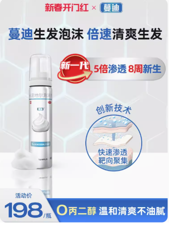 在消費者頗為關(guān)心的產(chǎn)品價格方面,“蔓迪泡沫劑”的活動價為198元/瓶,規(guī)格為60g/瓶,產(chǎn)品批準(zhǔn)文號:國藥準(zhǔn)字H20234731。作為一款全新升級的生發(fā)類產(chǎn)品,該產(chǎn)品的定價也頗具市場競爭力,讓更多消費者用合理的價格享受到更好的產(chǎn)品。