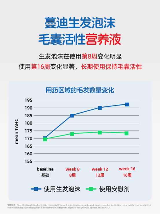 優(yōu)勢三:準(zhǔn)確給藥。傳統(tǒng)的溶液劑易揮發(fā),擦在頭皮上易析出結(jié)晶,影響藥物吸收。蔓迪泡沫劑中米諾地爾穩(wěn)定性更高,且具有不易揮發(fā)的特點,可以幫助提升藥物使用效果,并做到準(zhǔn)確給藥。