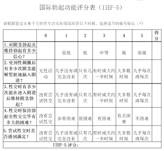 通常,IIEF-5評(píng)分小于7分為重度勃起功能障礙,8-11分為中度勃起功能障礙,12-21分為輕度勃起功能障礙,自我懷疑是不是有ED問(wèn)題的朋友,其實(shí)也可以從網(wǎng)上找量表自己先測(cè)試一下。
