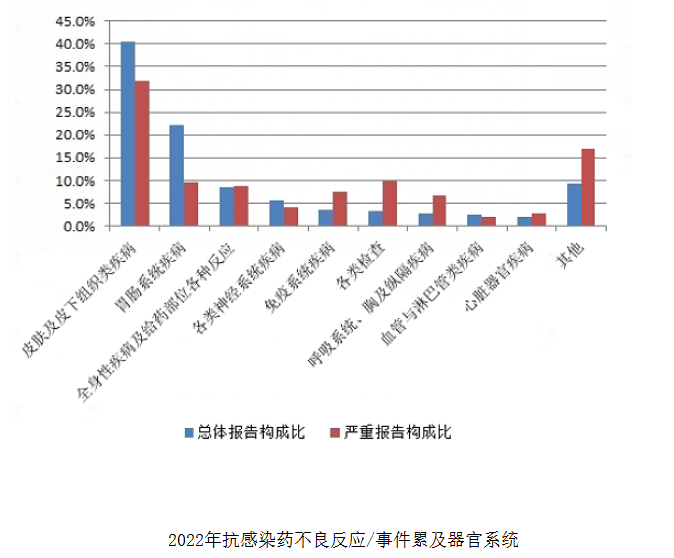 另外,國(guó)家每年公布的不良反應(yīng)監(jiān)測(cè)報(bào)告中,抗菌藥也是最常見的引起不良反應(yīng)的一大類藥品。在國(guó)家藥品不良反應(yīng)監(jiān)測(cè)年度報(bào)告(2022年)中,抗感染藥(包括抗生素、合成抗菌藥、抗真菌藥、抗病毒藥等)是臨床應(yīng)用最為廣泛的藥品類別之一,其不良反應(yīng)/事件報(bào)告數(shù)量一直居于首位,占2022年總體報(bào)告數(shù)量的28.0%,是藥品不良反應(yīng)監(jiān)測(cè)工作關(guān)注的重點(diǎn)。2022年抗感染藥不良反應(yīng)/事件報(bào)告數(shù)量排名前3位的藥品類別分別是頭孢菌素類、喹諾酮類、青霉素類。其累及器官系統(tǒng)情況詳見下圖。與抗感染藥的總體報(bào)告相比,嚴(yán)重報(bào)告的全身性疾病及給藥部位各種反應(yīng),免疫系統(tǒng)疾病,各類檢查,呼吸系統(tǒng)、胸及縱隔疾病,心臟器官疾病構(gòu)成比偏高。