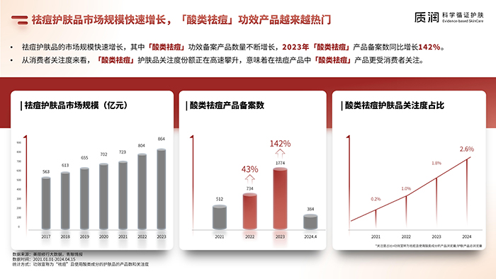 祛痘護(hù)膚品市場的快速增長,同樣得益于消費(fèi)者對健康肌膚的追求和對護(hù)膚品成分認(rèn)知的提高。隨著消費(fèi)者對護(hù)膚品成分和功效的關(guān)注增加,「酸類祛痘」產(chǎn)品因其明確的療效和科學(xué)依據(jù)而受到青睞。水楊酸與壬二酸作為祛痘的有效成分,得到國內(nèi)外指南的強(qiáng)力推薦,并被廣泛應(yīng)用于日常護(hù)膚品中。2023年「酸類祛痘」產(chǎn)品備案數(shù)同比增長142%,這一顯著的增長率預(yù)示著市場的廣闊前景。
