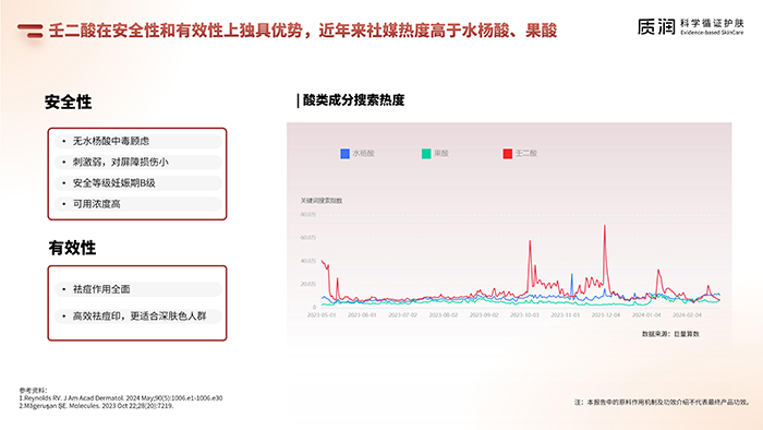 消費(fèi)者對祛痘產(chǎn)品的選擇越來越傾向于科學(xué)、有效且溫和的產(chǎn)品。其中,水楊酸的使用率達(dá)到了70%,但其對敏感肌膚的適用性存在局限。相比之下,壬二酸以其抗炎、抗菌、抗角化等多重功效,以及對敏感肌膚的友好性,逐漸成為消費(fèi)者的新寵。