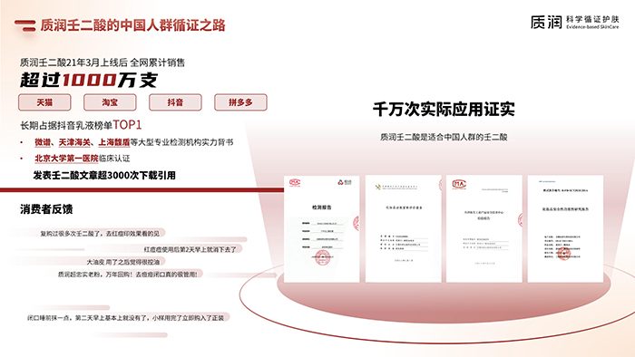 質(zhì)潤壬二酸產(chǎn)品自2021年3月上線以來,全網(wǎng)累計(jì)銷售已超過1000萬支,長期占據(jù)抖音乳液榜單TOP1,其市場表現(xiàn)強(qiáng)勁。這一成績不僅證明了質(zhì)潤產(chǎn)品的市場競爭力,更反映了消費(fèi)者對科學(xué)護(hù)膚理念的認(rèn)同。