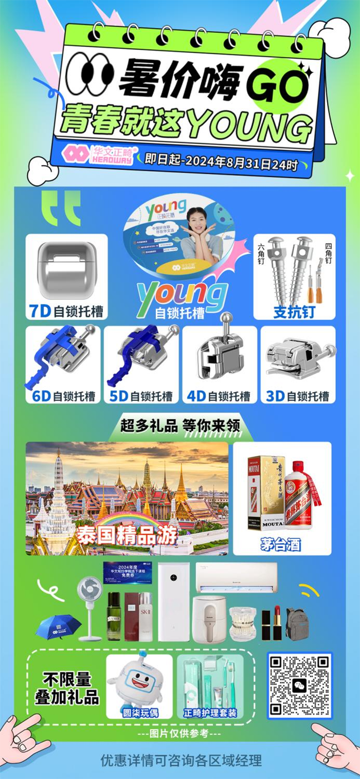 為了讓口腔醫(yī)療機構(gòu)囤定正畸耗材,滿足暑假超大量需求,華文正畸開展了滿額贈禮、增量送禮等優(yōu)惠活動。即日起至8月31日,下單華文正畸產(chǎn)品,即可享受大禮,活動覆蓋7D、6D、5D、4D、3D自鎖托槽、YOUNG自鎖托槽、支抗釘?shù)榷嗫町a(chǎn)品。