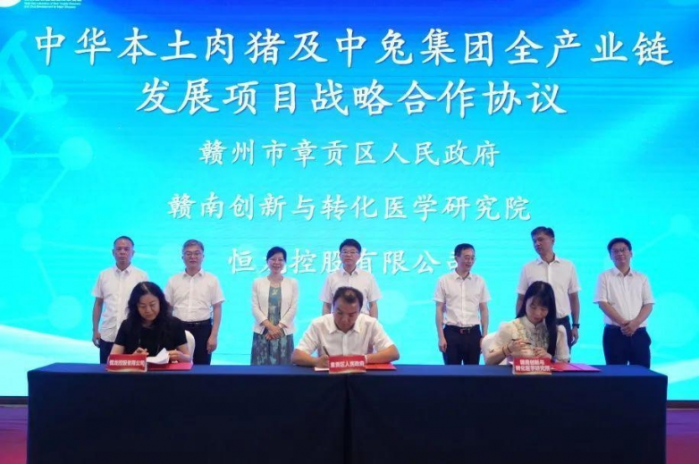 開幕式上,章貢區(qū)人民政府、贛南創(chuàng)新與轉(zhuǎn)化醫(yī)學(xué)研究院、恒龍控股中華本土肉豬及中兔集團(tuán)全產(chǎn)業(yè)鏈發(fā)展項(xiàng)目進(jìn)行合作簽約,項(xiàng)目將在特種經(jīng)濟(jì)動(dòng)物飼養(yǎng)、獸用疫苗、創(chuàng)新藥、醫(yī)療器械及寵物大健康等領(lǐng)域開展合作。