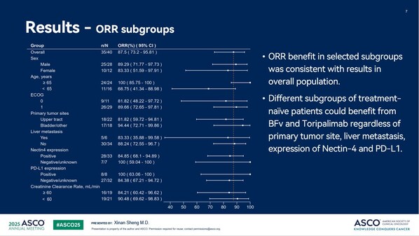 ORR 亞組分析顯示,在選定的亞組中,ORR 獲益與總體人群保持一致。無(wú)論年齡、腫瘤原發(fā)部位、是否基線存在肝轉(zhuǎn)移、以及腫瘤生物標(biāo)志物 Nectin-4 和 PD-L1 的表達(dá)狀態(tài),所有亞組均可從 9MW2821 聯(lián)合特瑞普利單抗的治療中獲益。年齡超過(guò)65 歲、腫瘤原發(fā)部位為下尿路、肝轉(zhuǎn)移、Nectin-4 表達(dá)陰性以及 PD-L1 表達(dá)陽(yáng)性的受試者 ORR 分別為100%(24/24)、94.44%(17/18)、83.33%(5/6)、100%(7/7)、100%(8/8)。