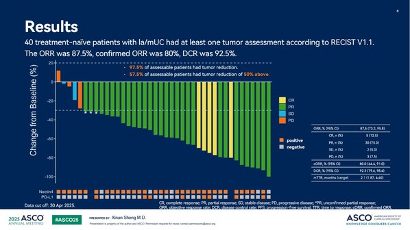截至2025 年 4 月 30 日,本研究共入組 52 例局部晚期或轉(zhuǎn)移性尿路上皮癌(la/mUC)受試者。40 例可腫評(píng)的晚期 UC 一線受試者中,中位年齡 67 歲,70% 為男性,72.5% ECOG 評(píng)分為 1 分,腫瘤原發(fā)部位為上尿路的占比 55%,肝轉(zhuǎn)移占比 15%。生物標(biāo)志物表達(dá)方面,82.5% 為 Nectin-4 表達(dá)陽(yáng)性,20% 為 PD-L1 表達(dá)陽(yáng)性。