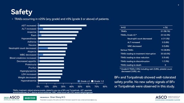 安全性方面,治療相關(guān)不良事件(TRAE)發(fā)生率為 98.1%,絕大多數(shù) TRAE 為 1-2 級(jí);3級(jí)及以上TRAE 發(fā)生率為 42.3%,≥3 級(jí)的 TRAE 主要表現(xiàn)為中性粒細(xì)胞計(jì)數(shù)降低(11.5%)、ALT 升高(5.8%)、白細(xì)胞計(jì)數(shù)降低(5.8%)等;治療相關(guān)嚴(yán)重不良事件的發(fā)生率為 28.8%,未發(fā)生導(dǎo)致死亡的 TRAE。聯(lián)合治療過(guò)程中,受試者整體耐受性良好,未觀察到新的安全性信號(hào)。