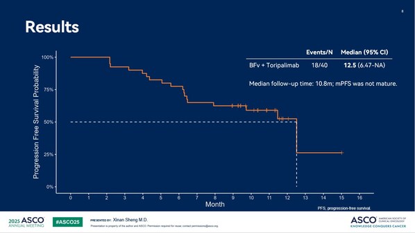 截至2025 年 4 月 30 日,45%(18/40)受試者發(fā)生疾病進(jìn)展或死亡,中位無(wú)進(jìn)展生存期(mPFS)為 12.5 個(gè)月(95% CI:6.47-NA),中位緩解持續(xù)時(shí)間(mDoR)尚未達(dá)到。中位隨訪時(shí)間為 10.8 個(gè)月,mPFS 和 mDoR 尚未成熟。