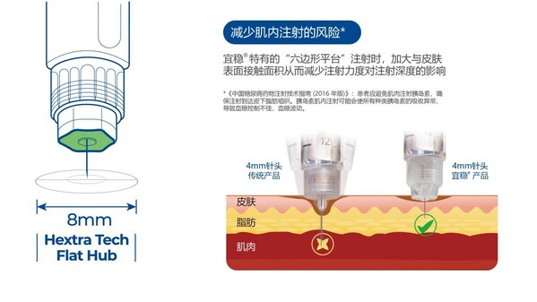 大量研究發(fā)現(xiàn),胰島素肌內(nèi)注射可能導(dǎo)致頻繁的不明原因的低血糖。胰島素肌內(nèi)注射還會增加發(fā)生出血、淤青及疼痛的風(fēng)險(xiǎn)。除針頭長度和注射技術(shù)外,針座設(shè)計(jì)是控制注射深度的主要因素,宜穩(wěn)胰島素針頭的大平面設(shè)計(jì)使注射深度受注射施加力的影響有限,更接近4mm針頭長度。在剛剛發(fā)布的《2025年中國糖尿病患者注射類降糖藥物使用教育管理規(guī)范》中,對于胰島素注射筆用針頭明確提出"使用時(shí),為避免注射到肌肉層,建議使用大面積針座(如六棱鼓面針座)"。