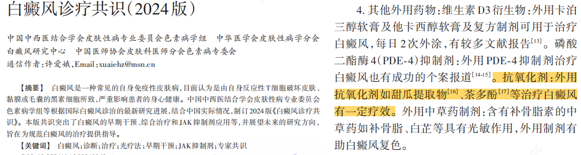 面對光療的局限性,《中國白癜風(fēng)診療共識(2024版)》明確指出,光療聯(lián)合療法效果優(yōu)于單一療法。聯(lián)合治療方案包括聯(lián)合口服或外用激素、口服及外用抗氧化劑等。其中,外用抗氧化劑因其可同步增強(qiáng)光療療效并降低副作用,成為近年研究熱點。