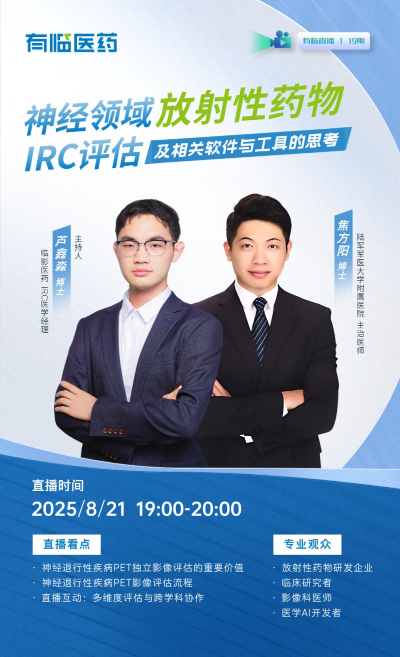 8月21日(周四)19:00,歡迎鎖定有臨醫(yī)藥直播間——主持人臨影醫(yī)藥醫(yī)學經理蘆鑫淼博士,將邀請復旦大學博士、陸軍軍醫(yī)大學附屬醫(yī)院主治醫(yī)師焦方陽博士,共探神經領域放射性藥物影像評估的標準化、自動化與智能化前沿。