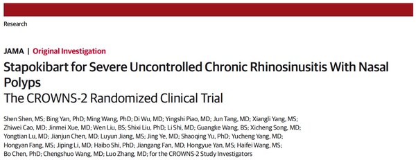 2025年8月18日,首都醫(yī)科大學(xué)附屬北京同仁醫(yī)院張羅教授與王成碩教授作為共同通訊作者,在國(guó)際頂級(jí)期刊《美國(guó)醫(yī)學(xué)會(huì)雜志》(JAMA,影響因子 55.0)發(fā)表突破性研究成果 —— 康悅達(dá)(司普奇拜單抗)治療嚴(yán)重未控制的慢性鼻竇炎伴鼻息肉(CRSwNP)Ⅲ期臨床研究(CROWNS-2)結(jié)果。這是中國(guó)鼻科領(lǐng)域創(chuàng)新藥研究首次登頂JAMA,表明由國(guó)內(nèi)自主研發(fā)、我國(guó)科學(xué)家牽頭開展的生物制劑治療難治性慢性鼻竇炎伴鼻息肉研究獲國(guó)際學(xué)術(shù)界高度認(rèn)可,為該疾病治療提供了全新的 "中國(guó)方案"。