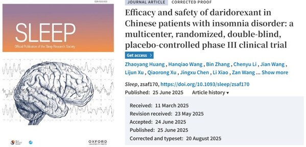 2025年8月20日,新型雙食欲素受體拮抗劑(DORA)類抗失眠達(dá)利雷生中國Ⅲ期臨床試驗數(shù)據(jù)在世界睡眠研究協(xié)會官方出版物《睡眠》雜志(SLEEP )正式發(fā)表。結(jié)果顯示:針對中國失眠人群,達(dá)利雷生在睡眠維持、加快入睡和延長睡眠時間等指標(biāo)上均取得陽性結(jié)果,且清晨嗜睡發(fā)生率低。作為首個在中國失眠人群Ⅲ期臨床研究主要及關(guān)鍵次要研究終點均取得陽性結(jié)果,且公開發(fā)表的全新一代DORA類抗失眠藥物,達(dá)利雷生為中國數(shù)億失眠人群帶來突破性治療選擇。