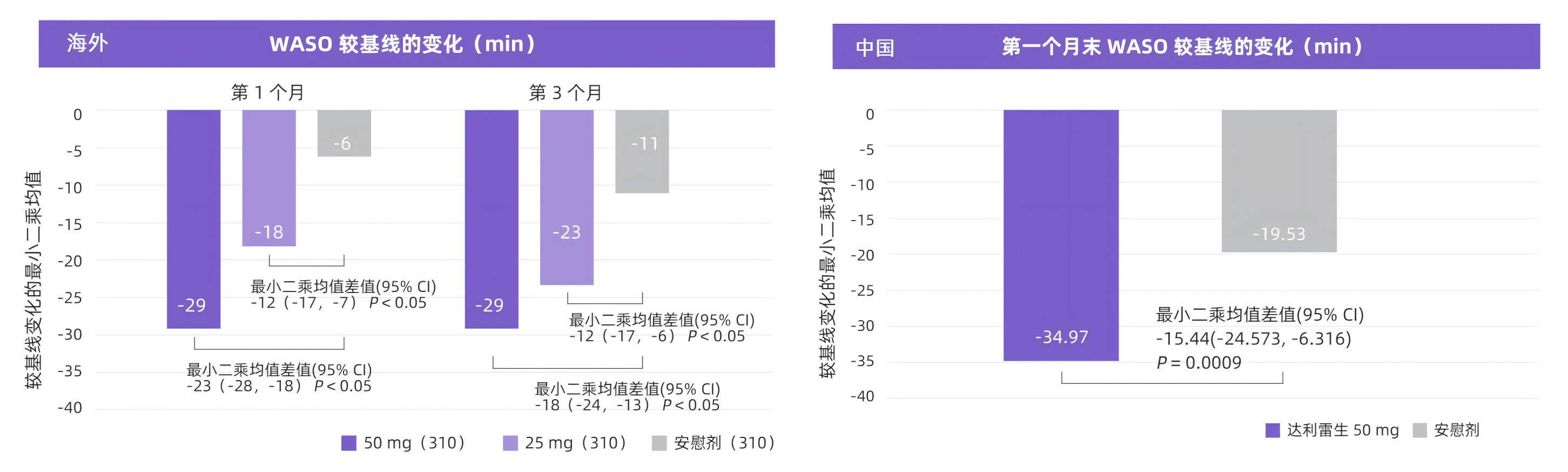 圖 2,3 海外和中國 Ⅲ 期臨床研究:達利雷生與安慰劑相比,較基線期 WASO 的改變情況