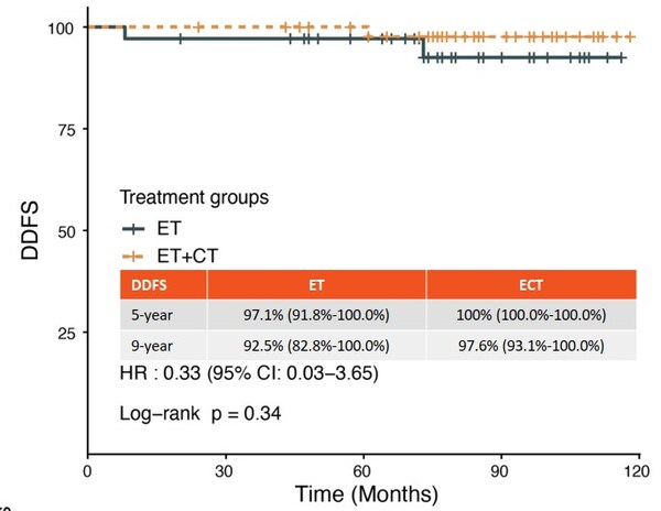 ? LRP低危人群在接受化療或不化療的9年DDFS均較好,且基本保持一致,預(yù)示該類人群可考慮豁免化療;