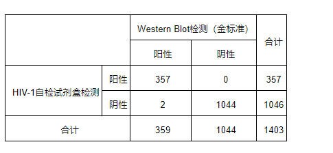 表1尿液HIV-1自測試劑盒與金標(biāo)準(zhǔn)的檢測結(jié)果比對