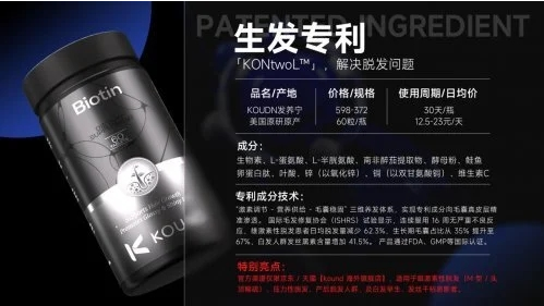 不同于普通含生物素的產(chǎn)品僅能補充營養(yǎng),KOUND 發(fā)養(yǎng)寧聚焦影響毛囊健康的相關(guān)因素。依托創(chuàng)新技術(shù),研發(fā)出相關(guān)專利成分(專利號可查詢品牌官方),多重專利成分協(xié)同作用,同時將生物素、L - 蛋氨酸等成分科學(xué)配比融合,為毛囊提供多維度營養(yǎng)支持。更有復(fù)合元素相關(guān)專利,萃取多種優(yōu)質(zhì)成分,通過先進提純技術(shù),助力成分吸收利用率提升。