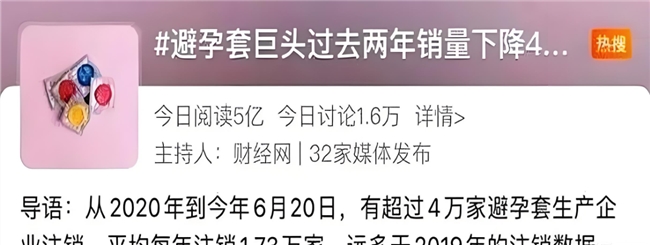 避孕套與情趣用品市場(chǎng)的 “冰火兩重天”,更直觀地展現(xiàn)了消費(fèi)場(chǎng)景與需求結(jié)構(gòu)的重構(gòu)。根據(jù)《2024 年中國(guó)避孕套行業(yè)發(fā)展報(bào)告》,2024 年國(guó)內(nèi)避孕套全渠道銷售額從 2023 年的 187.86 億元降至 156 億元,跌幅達(dá) 17%;頭部品牌線上銷量從 2019 年的 372.2 萬件跌至 2021 年的 84.2 萬件,2024 年中國(guó)區(qū)線上市場(chǎng)份額縮至 29.3%。伴隨銷量下滑的是企業(yè)的大規(guī)模退出,2020-2024 年間,全國(guó)超 7.8 萬家避孕套相關(guān)企業(yè)注銷,年均注銷 1.73 萬家。